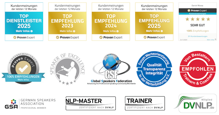 Daniel Mossa ist zertifizierter NLP-Master-Trainer, Coach und professionelles Mitglied der German Speakers Association sowie der Global Speakers Federation.